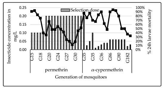 The selection at the larval stage was chosen for three reasons. First, evolutionary pressure is strongest in young individuals to increase the probability of survival to reproductive maturity. Second, beneficial mutations at an older age can be associated with harmful effects in young individuals [64,65,66]. Third, by exerting the selection pressure to the aquatic stage of the mosquitoes, there is assurance for successive selection as it is impossible for larvae to survive subsequent selections but only through developing resistance [67]. Additionally, many reports have associated larvae exposure to trace amounts of pesticides with the development of insecticide resistance in malaria vectors [68,69,70,71].