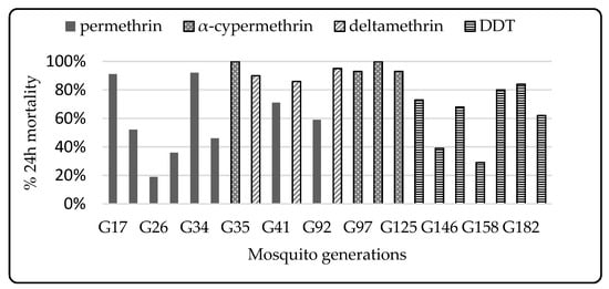 On average, the Muleba-Kisumu strain’s mortality was below the cutoff point (90%) when tested against permethrin (type I pyrethroid) and DDT papers. Only results with control mortality that were less than 20% were considered for analysis; tests when control mortality was higher than 20% were rejected. When tested against alpha-cypermethrin and deltamethrin (type II pyrethroids), the resistance level was low and above the cutoff value, which is suggestive of susceptibility to this pyrethroid class. However, although several mosquito mortalities were above 90%, during the 35th, 89th, 97th, and 125th generations mortalities scored below 98%, which could imply existence of resistance.