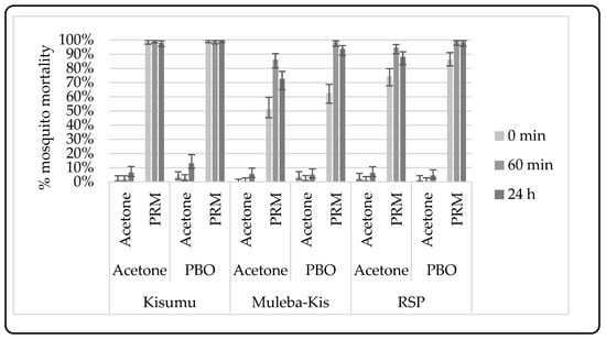 The knockdown and mortality rates of An. gambiae Kisumu and An. gambiae Muleba-Kis with and without PBO pre-exposure. Error bars are equivalent to 95% confidence intervals. PRM = Permethrin, PBO = Piperonyl butoxide.