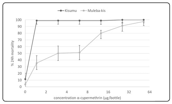 Exposure of the Kisumu strain against alphacypermethrin in CDC bottles resulted in high mortality, indicating susceptibility against all doses, starting with a low dosage of 1.466 µg/bottle to the highest at 52.5 µg/bottle. On the other hand, exposure to the Muleba-Kis strain showed a dose-response, with mortality as low as 37% against the lowest dose and increasing to 98% mortality at four times the diagnostic dose.