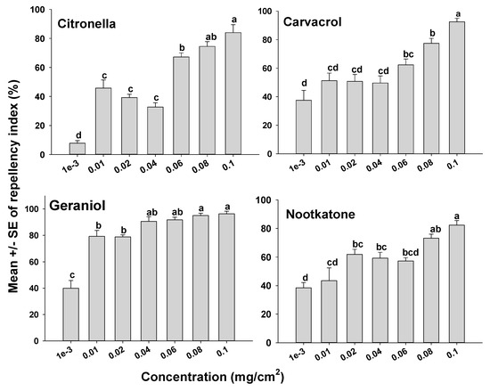 Nootkatone was less effective at repelling mites when compared to the other terpenes that were tested. However, due to nootkatone’s mild odor in comparison to other essential oils, it is recommended for consideration in further experiments, since it protected ham pieces from ham mites by reducing the number of eggs laid by the mites. Earlier work with nootkatone reported repellency percentages that ranged from 46.3 to 93.1% and 39.2 to 67.3% against maize and rice weevils, respectively, as nootkatone concentrations increased from 0.05 to 5% (w/v) in methanol [21]. It was concluded that nootkatone was a good repellent candidate for insect pest management. Similarly, when nootkatone was used in the present study, the highest repellency index was achieved at the highest concentration of 0.1 mg/cm with an RI of 82.3%.