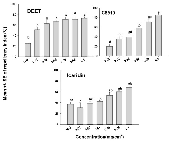 Orientation response of T. putrescentiae on glass surfaces treated with synthetic repellents in a laboratory two-choice behavioral assay. ANOVA determined that there was significant variation among concentrations for each of the compounds tested (F-value ranged from 6.12 to 19.25 and p-value ranging from <0.01 to 0.03). Mean (± SE; n = 5) RIs for a given repellent with the same letter are not significantly different (REGWQ; p > 0.05).