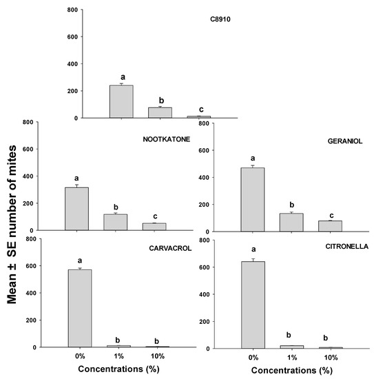 This study focused on the population growth of ham mites on ham cubes when they were treated with either C8910, nootkatone, geraniol, citronella, or cavacrol, all of which were effective at repelling mites (Figure 1 and Figure 2; Table 2 and Table 3). Mite numbers produced on ham cubes dipped in solutions of C8910 and the four terpenoids were significantly lower in all treatments than the number of mites produced on the solvent controls (Figure 3). The terpenoids at different concentrations caused a reduction in mite reproduction after 14 days. Mite numbers on ham cubes treated with either a 10% concentration of nootkatone, geraniol, C8910, citronella, or carvacrol in acetone were significantly reduced to means (and SEs) of 51.6 (3.67), 78.8 (2.99), 12.4 (4.06), 8.2 (1.43), and 4.4 (0.74) respectively, when compared to controls. There were no significant differences observed between 1% and 10% concentrations in citronella and carvacrol, whereas the other oils differed significantly at these concentrations. This makes citronella and carvacrol the most effective at reducing the population of mites when used at dosages of 1 or 10%. Generally, all essential oils and the fatty acid mixtures reduced mite population growth substantially when applied on ham pieces.