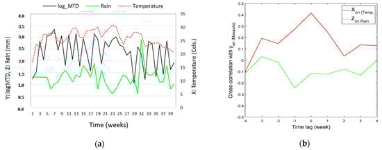 Let X(t) be the ecological variable (e.g., mosquito population, or climatic variable), which is considered as a stochastic process that evolves in time t and is defined in a probability space (Ω, F, P). Where Ω is a sample space, F is a set of outcomes in the sample space and P assigns each event of F a probability. If the number of F is not countable then the process is denoted by (X (t): t ≥ 0), or (Xt) t ≥ 0. In the first case, the process is called a chain in discrete time and in the second, in continuous time. Here the first case is considered, since data have been observed in specific time points and not continuously.