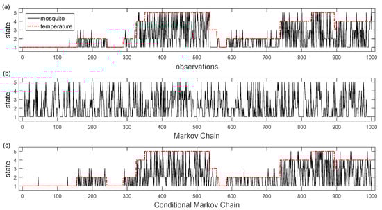 Moreover, to reach more realistic Markov chain projection schemes, they should probably be compared and trained with additional observational data. Nevertheless, the current work outlines how the Markov chain models can be applied in ecological time series and particularly in modeling arthropod vector dynamics. Furthermore, the current work contributes to recent tendencies in ecological modeling which focus on the integration of climate factors and related weather variables in functioning of population processes. Another future direction which may be worth verifying would be the calculation of a multivariate semi-Markov conditional model with different orders.