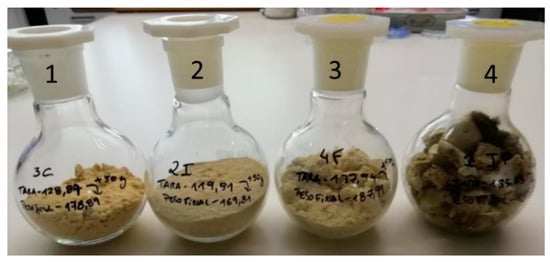The final aspect of the interaction assays using maize flour: 1—control (containing only maize flour), 2—insect (maize flour and Tribolium castaneum), 3—fungus (maize flour and Aspergillus flavus) and 4—mixed (maize flour, T. castaneum and A. flavus).