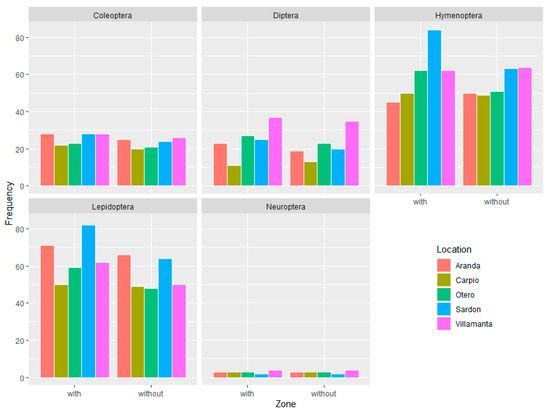 During the three-year research programme, a total of 7950 insects belonging to Coleoptera (1583), Diptera (1440), Hymenoptera (2291), Lepidoptera (2300), and Neuroptera (336) were collected. Of them, 3308 individuals (125 genera) were captured from the area without cover plants and 4642 (139 genera) from the area with. All the farms showed a greater number of genera and individuals in the areas with cover plants than without (Table 2). Similar results were observed when analysing the abundance of genera in order in each of the sampling areas and treatment zone (Figure 1). The complete list of genera found in each locality, year, and study zone (with and without cover plants) is provided in Supplementary Materials.