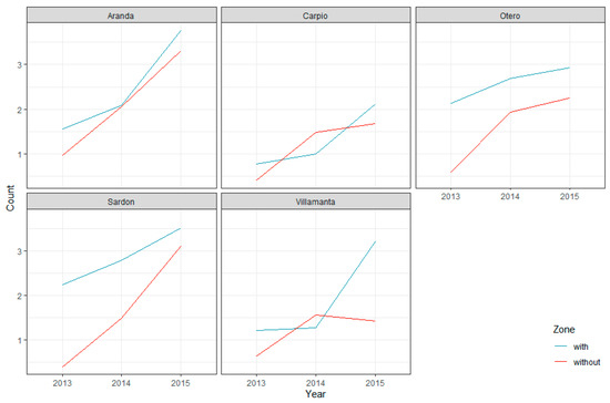 An exploratory data analysis was initially performed to describe the behaviour of the total number of insects under the assessed determinants. Figure 2 shows the changes in the average number of insects between zones, farms, and years. There is a clear trend of the average number of insects increasing through the years in all farms. However, this trend does not seem to be the same between farms, which differs the rate of change. In most cases, the zones with cover plants have a higher number of insects in comparison with the zones without cover plants. Additionally, there is an interaction effect among the zones and the years.