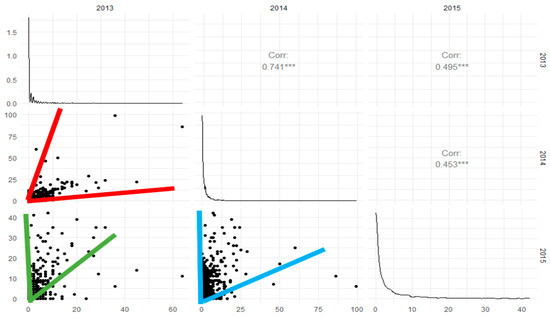 Additionally, a study of the structure of temporal correlation between the count of insects through the years was conducted. To do that, we plotted a scatterplot matrix among the total number of insects in each observed year and tested the statistical significance of Pearson’s correlation coefficient of the counts among years. Figure 3 presents the results of the analysis and indicates that the number of insects is significantly correlated between the years. The funnel-shaped clouds of points also reveal an effect of unequal variability of the number of insects between years that talks about the complexity of insect population dynamics among the contrasting farming environments.