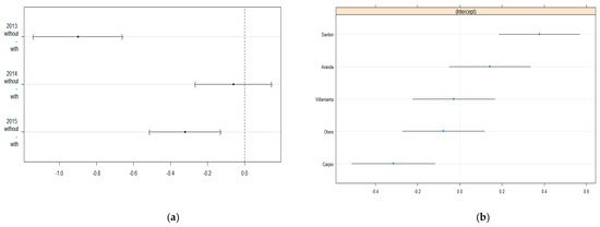Regarding the random effect associated with the farms, the estimated parameters, related to the random intercepts (see Figure 4b), show that Carpio and Sardón were statistically significant contrasting environments. Sardón had a higher total number of insects while Carpio had a lower count of insects. The other three farms did not show significant differences since the confidence intervals for the random intercepts contain the value zero.