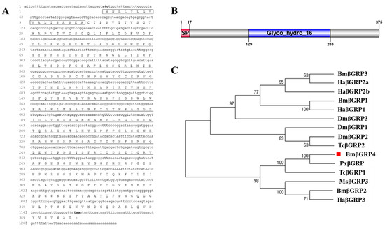 3.1. Identification of BmβGRP4 and Bioinformatics Analysis