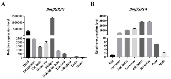 3.2. Tissue Distribution and Developmental Stage Expression of BmβGRP4