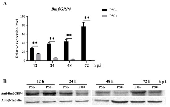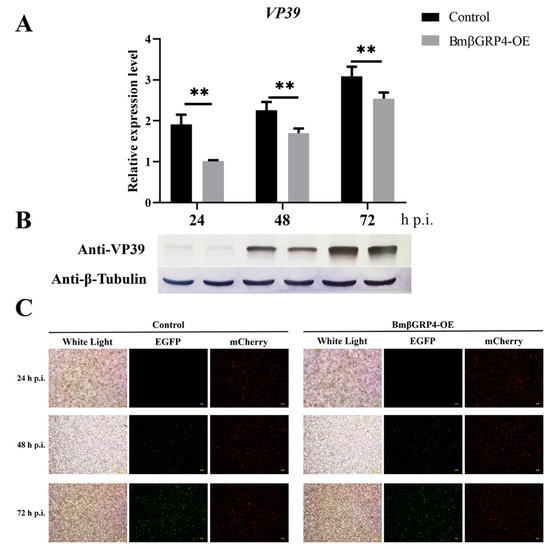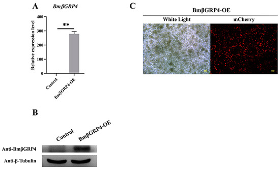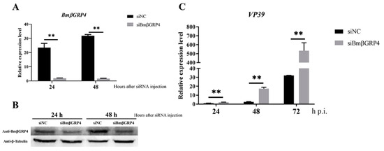 3.6. Overexpression of BmβGRP4 Suppressed Virus Proliferation in BmN Cells