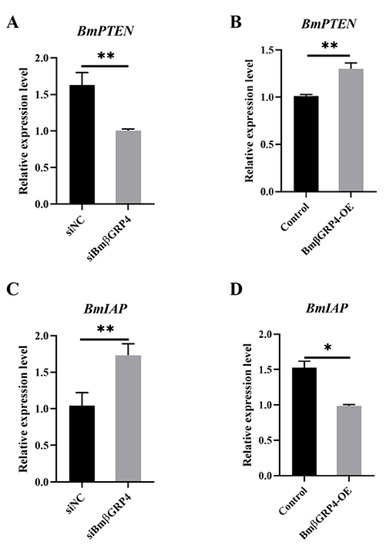 3.8. BmβGRP4 Positively Regulated BmPTEN and Negatively Regulated BmIAP
