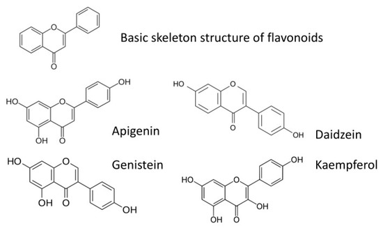 Basic skeleton structure of flavonoids and structures of flavonoids applied in the present study: apigenin, daidzein, genistein, and kaempferol.