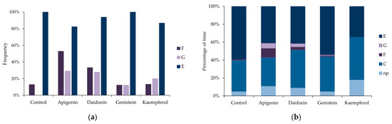 On peas treated with 0.1% daidzein, 9% of the time was assigned to non-probing, 42% to pathway C, and 41% to the phloem phase. Activity F occurred in 33% of aphids and occupied 3% of the time, while G occurred in 28% of aphids and engaged 4% of the time (Table 1, Figure 2a,b). Aphids made significantly fewer brief probes than on the control: there were 1.5 fewer brief probes in general (Table 1; Kruskal–Wallis test; p < 0.05), but the number of brief probes before the first phloem phase was similar as compared to the control (Table 1). Although nearly all aphids reached the phloem phase (Figure 3a), they needed almost three times more time to reach the sieve elements than on the control. At the same time, the number of phloem phases was significantly lower in aphids on daidzein-treated plants than in aphids on the control peas (Table 1). Generally, the proportion of time assigned to sap ingestion was slightly lower than in the control and never exceeded 60% of all aphid activities on plants (49% at the end of the monitoring period) (Figure 3d).