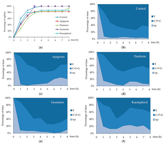 Sequential changes in EPG-recorded stylet penetration activities of Acyrthosiphon pisum on Pisum sativum: (a) Cumulative percentage of aphids that attained phloem phase during the 8 h EPG monitoring on P. sativum treated with 0.1% apigenin, daidzein, genistein and kaempferol; (b) sequential changes in penetration activities of A. pisum on control untreated P. sativum; (c) sequential changes in penetration activities of A. pisum on P. sativum treated with 0.1% apigenin; (d) sequential changes in penetration activities of A. pisum on P. sativum treated with 0.1% daidzein; (e) sequential changes in penetration activities of A. pisum on P. sativum treated with 0.1% genistein; (f) sequential changes in penetration activities of A. pisum on P. sativum treated with 0.1% kaempferol. Panels (b–f) represent the proportion of time (average percentage of cumulative time for aphids in the group) devoted to np—non-probing, C + F + G—pathway + derailed stylet activities + xylem phase, and E—phloem phase E1 (salivation) + E2 (sap ingestion) activities of A. pisum during the consecutive hours of 8 h EPG recording (control n = 23; apigenin-treated n = 17; daidzein-treated n = 18; genistein-treated n = 16; kaempferol-treated n = 15).