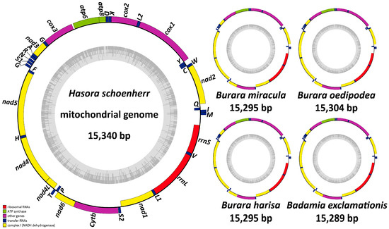 The following information was supplied regarding the availability of DNA sequences: The complete mitogenomes of H. schoenherr, B. miracula, B. oedipodea, B. harisa, and B. exclamationis have already been uploaded to the GenBank with the Accession Numbers MZ502493, MZ502491, MZ502492, MZ502490, and MZ502489, respectively.