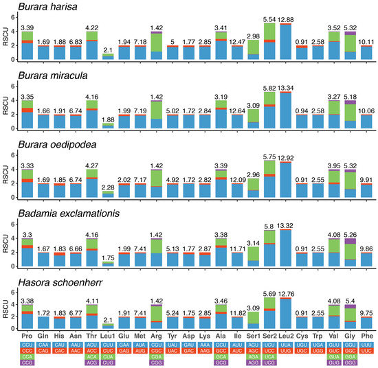 The total lengths of 13 the PCGs of H. schoenherr, B. miracula, B. oedipodea, B. harisa, and B. exclamationis are 11,196 bp, 11,205 bp, 11,193 bp, 11,187 bp, and 11,199 bp, respectively. Of the 13 PCGs, the smallest gene is the atp8, and the largest gene is the nad5, ranging from 162 bp to 1743 bp in B. miracula and B. exclamationis, respectively (Table S2). The five species mentioned above have negative AT-skews (mean = −0.1582) and positive GC-skews (mean = 0.0156) in PCGs (Table S1). Across the 13 PCGs, only four PCGs (nad1, nad4, nad4L, and nad5) are encoded on the N-strand, whereas the other nine (cox1, cox2, cox3, atp6, atp8, nad2, nad3, nad6, and Cytb) are located on the J-strand. Almost all PCGs in the five species start with the standard codon ATN (ATC, ATG, ATT, and ATA), except for cox1 in H. schoenherr, B. oedipodea, B. harisa, and B. exclamationis, using the CGA as the start codon [31], while cox1 in B. miracula starts with ATT. Stop codons in the PCGs include three types: TAA, TAG, or T. Most stop codons are TAA, except nad3 of B. miracula and B. oedipodea, and nad2 of B. harisa, which stop with the termination codon TAG, while an incomplete stop codon T- was found in the cox1, cox2, nad4, and nad5 in H. schoenherr, B. miracula, B. oedipodea, and B. harisa, and cox1, cox2, and nad4 in B. exclamationis. Therefore, the occurrence of the termination codon TAA is more common than TAG, and at least three incomplete stop codons and T-codons are present in all five mitogenomes (Table S2). Statistics on the relative synonymous codon usage (RSCU) of the five skippers show that the codon UUA (Leu2) is used most frequently (Figure 2).