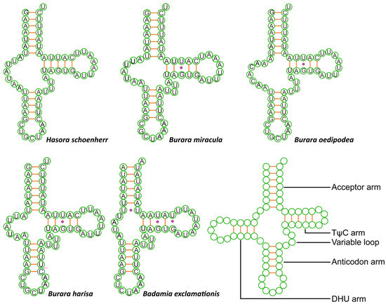 The total lengths of the 22 tRNAs of the five species range between 1458 bp (H. schoenherr) and 1470 bp (B. harisa), with an average value of 1464 bp, which is consistent with typical Lepidoptera species [6,15,26]. The 22 tRNA sizes range from 61 bp (trnS1) to 71 bp (trnK) in H. schoenherr, from 61 bp (trnS1) to 72 bp (trnD) in B. miracula, from 61 bp (trnS) to 71 bp (trnK) in B. oedipodea and B. harisa, and from 58 bp (trnS1) to 71 bp (trnK) in B. exclamationis (Table S2). All tRNAs can be folded into a typical cloverleaf structure except for trnS1 (Figure 3). Due to the limited length of this manuscript, the remaining tRNA secondary structures are presented in the supplementary materials (Figures S6–S10). Most of the 22 tRNAs in these mitogenomes demonstrate a positive AT-skew and GC-skew, except for the identical content of the A and T found in B. exclamationis (Table S1).