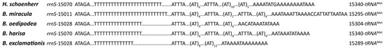 The AT-rich region, also named the control region, is the largest non-coding region in the mitogenome and is responsible for the origin of transcription and replication [45,46]. This region, the sizes of which in the five species ranges from 262 bp (B. exclamationis) to 285 bp (B. miracula), is located between rrnS and trnM. Like typical lepidopteran insects [6,15,26], the A + T contents of the control region are the highest in mitogenomes with the mean value 93.84% (Table S1).