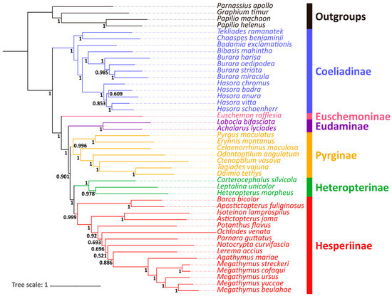 Our results indicate that the phylogenetic positions of the subfamilies in Hesperiidae are (Coeliadinae + (Euschemoninae + (Eudaminae + (Pyrginae + (Heteropterinae + Hesperiinae))))), with most branches receiving a high support value and confirming the monophyly of the six main subfamilies. In order to highlight the focused taxon (Coeliadinae) and simplify the analysis, the Pyrginae and Hesperiinae included here are all Pyrginae sensu lato and Hesperiinae sensu lato as suggested by Hao et al. [6]. The five species we mainly focused on are all members of Coeliadinae, which is the basal lineage among Hesperiidae, and is strongly supported (PP = 1) as a sister to the remaining subfamilies.