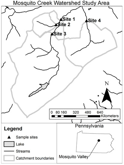 All field work was conducted within the Mosquito Creek watershed in Pennsylvania located in the piedmont physiographic province (Figure 1). Samples were collected at four stream reaches from three different streams (Figure 1; Table 1). Stream reaches sampled were 1st, 2nd, and 3rd order but had similar characteristics. Sub-catchment size ranged from 1.6 to 19.1 km2. The overall catchment for Mosquito Creek is primarily forested (Table 1) but also contained agricultural land use upstream of Sites 1 and 3. The catchment’s forest was composed of a mix of conifers and hardwoods.