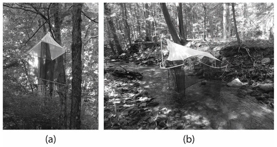 Townes-style malaise [25] and malaise canopy traps (Sante Traps, Lexington, KY, USA) were used to measure adult stream insect activity at ground level and in the forest canopy, respectively (Figure 2), and are referred to as “ground” and “canopy” traps for this study. The traps collected all terrestrial and aquatic flying insects, but this study focused on Plecoptera (stoneflies) and Trichoptera (caddisflies) with an additional focus on plecopteran families [26]. This study focused on stonefly families because they are associated with healthy stream ecosystems, are common indicators of stream health, were known to use riparian vegetation, and were ubiquitous throughout our study location (see [4] for more information on Plecoptera biology and life history). Previous research demonstrated that flight intercept traps (i.e., malaise traps) were efficient for trapping adult caddisflies and stoneflies, e.g., [20].
