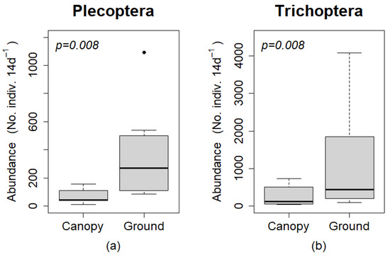 Box plots comparing estimated abundances (No. individuals per 14 day period) of (a) Plecoptera and (b) Trichoptera among canopy and ground traps. Boxes represent upper and lower quartiles, and whiskers extend to values no greater than or less than 1.5 times the inter-quartile range of the upper and lower quartiles, respectively. Points (•) are outliers outside the values of the whiskers. Statistical comparisons were performed using a Wilcoxon sign rank test.