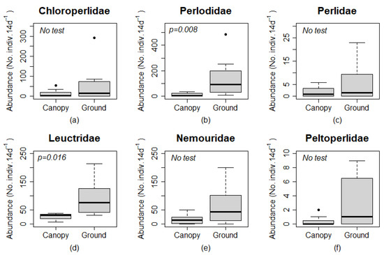 Box plots comparing abundances (No. individuals per 14 day period) of plecopteran families (a–f) among canopy and ground traps. Box plots include zero data, and statistical significance are only shown for taxa without paired zero abundances among trap types. Boxes represent upper and lower quartiles, and whiskers extend to values no greater than or less than 1.5 times the inter-quartile range of the upper and lower quartiles, respectively. Points (•) are outliers outside the values of the whiskers. Statistical comparisons were performed using a Wilcoxon sign rank test.