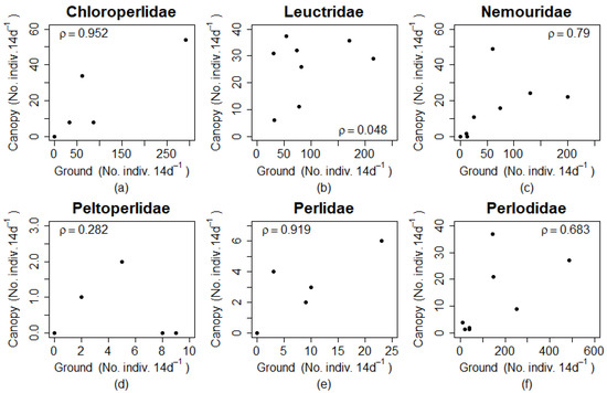 Scatter plot of paired ground and canopy trap abundances for each site and season individually for all (a–f) plecopteran families. Spearman rank-order correlation coefficients (ρ) indicate the strength of correlation for paired samples and are reported for each family.