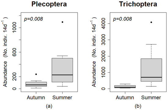 A significantly greater number of individuals for Plecoptera and Trichoptera, were captured during the summer sampling period than the autumn sampling period (p = 0.008 for both orders; Figure 6). The abundance of individuals per 14 day period was greater in the summer sampling period than the autumn sampling period for every paired sample (same trap type and site) for both orders.