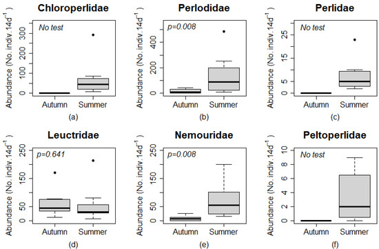 Box plots comparing abundances (No. individuals per 14 day period) of plecopteran families (a–f) among sampling period. Boxes represent upper and lower quartiles, and whiskers extend to values no greater than or less than 1.5 times the inter-quartile range of the upper and lower quartiles, respectively. Points (•) are outliers outside the values of the whiskers. Statistical comparisons were performed using a Wilcoxon sign rank test.