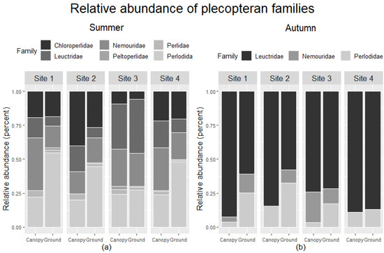 The relative abundance of plecopteran families found in canopy and ground traps among sites for the (a) summer and (b) autumn collections.