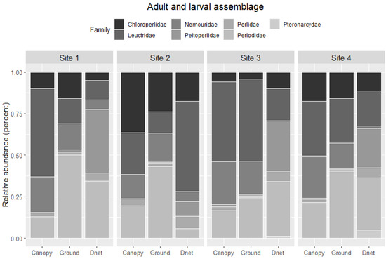 Stacked bar chart representing relative abundance and assemblage composition at each site for adult plecopteran taxa in ground and canopy traps and larval plecopteran taxa in benthic samples. Abundances for ground and canopy traps from summer and autumn samples are combined for this analysis.