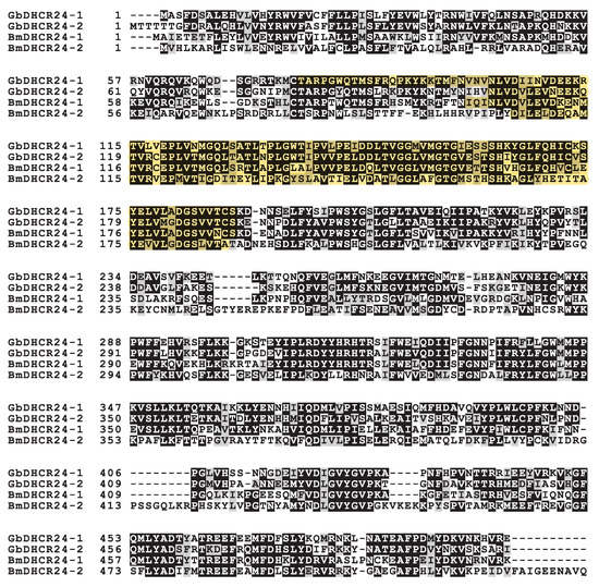 Alignment of G. bimaculatus DHCR24s (GbDHCR24-1 and GbDHCR24-2) and B. mori DHCR24 (BmDHCR24-1 and BmDHCR24-2). Identical amino acids at the same position are shaded in black, and similar amino acids at the same position are shaded in pale grey. The region matching the FAD binding domain on the Pfam database is highlighted in yellow.