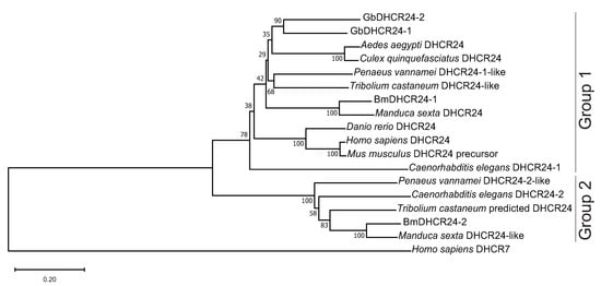In order to identify the homologous cDNAs encoding DHCR24 in G. bimaculatus, we searched the cDNA sequences based on the B. mori DHCR24 two homologues (BmDHCR24-1 and BmDHCR24-2) in our in-house database from RNA-sequencing analyses [13,14]. The BLAST search resulted in two nucleotide sequences encoding DHCR24 homologues in G. bimaculatus DHCR24, GbDHCR24-1 and GbDHCR24-2. cDNA sequences encoding GbDHCR24-1 and GbDHCR24-2 contained open reading frames of 1506 bp and 1515 bp, respectively. The deduced amino acid sequences were composed of 501 and 504 amino acids, respectively (Figure 1). The amino acid sequence of GbDHCR24-1 showed 56% and 39% identities to the amino acid sequences of BmDHCR24-1 and BmDHCR24-2, respectively. The amino acid sequence of GbDHCR24-2 showed 58% and 39% identities to the amino acid sequences of BmDHCR24-1 and BmDHCR24-2, respectively. The amino acid sequence of GbDHCR24-1 matched 66% of the sequence of GbDHCR24-2. Likewise, in the amino acid sequences of BmDHCR24s, the Pfam database showed that both GbDHCR24-1 and GbDHCR24-2 sequences of crickets contained flavin adenine dinucleotide (FAD) binding domain [20]. Next, we analysed the phylogenetic relationship between GbDHCR24s and the DHCR24 of the other species, including human, mouse and other insects (Figure 2). Using the distantly related 7-dehydrocholesterol reductase as an outgroup, the phylogenetic tree showed two distinct groups. Both GbDHCR24s clustered with group one, which also contained BmDHCR24-1 and the vertebrate DHCR24s. Group two was mostly consisted of DHCR24 sequences of non-vertebrate species.