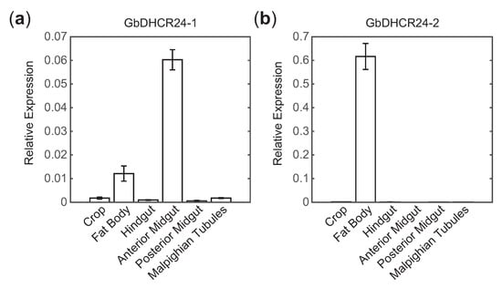 In order to analyse the expression sites of GbDHCR24s in crickets, quantitative real-time polymerase chain reaction (qPCR) was performed to measure the transcriptional levels of GbDHCR24s in tissues (crop, fat body, hindgut, anterior midgut, posterior midgut and Malpighian tubules). The highest transcriptional level of GbDHCR24-1 was observed in the anterior midgut (Figure 3a). On the other hand, the transcriptional level of GbDHCR24-2 was the highest in fat body (Figure 3b).