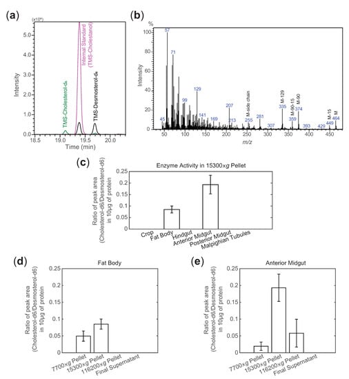 Examination of DHCR24 activity in fat body and anterior midgut. (a) Chromatogram of parent ions of TMS-cholesterol-d6 (m/z 464), TMS-cholestanol as an internal standard (m/z 460) and TMS-desmosterol-d6 (m/z 462). (b) Mass spectrum of cholesterol-d6 detected in the reacted mixture. The parent ion of cholesterol-d6 is at m/z 464 (M) and the characteristic fragment ions, at m/z 449 (M-15), 374 (M-90), 359 (M-90-15) and 335 (M-129), are derived by the loss of trimethylsilanol (TMSOH) (M-90), loss of methyl group (M-15), loss of both TMSOH and methyl group (M-90-15) and loss of the characteristic of 3-hydroxy-5-ene steroids (M-129), respectively (Table S2). (c) The enzyme activity in the fraction that exhibited the strongest enzyme activity in different tissues. (d,e) The intensity of GbDHCR24 activity in fat body and anterior midgut was measured by the peak area ratio of cholesterol-d6 to desmosterol-d6 in four ultracentrifugal fractions, 7700× g-pellet fraction, 15,300× g-pellet fraction, 116,200× g-pellet fraction and final supernatant (n = 5–12). Data are presented as mean ± SEM.