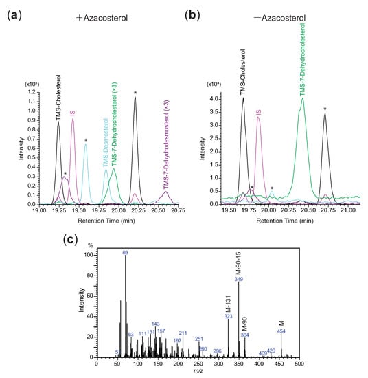 Chromatogram of ions corresponding to TMS-desmosterol (m/z 343) and TMS-7-dehydrodesmosterol (m/z 349) detected in anterior midgut of (a) crickets fed on diet containing azacosterol and that of (b) crickets fed on diet without azacosterol. The number of times the peak was magnified is indicated in the bracket next to the sterol name. (c) Mass spectrum of TMS-7-dehydrodesmosterol detected in all anterior midgut samples of crickets in this study (n = 7). The * indicates the peaks of sterols (Unidentified sterol (RRT = 1.005), TMS-5-cholesta-7,22-dien-3-ol (RRT = 0.992) and TMS-lathosterol (RRT = 0.961) that were not studied in this paper.