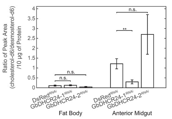 Enzyme activity of the 15,300× g-pellet fraction extracted from fat body and anterior midgut of GbDHCR24 knockdown crickets (n = 6). The changes in enzyme activity between the DsRed and GbDHCR24 crickets were analysed by the Mann–Whitney U test. The significance is indicated by ** p < 0.01. n.s. indicates no significance between groups. Data are presented as mean ± SEM.