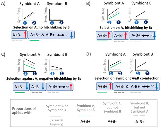 Hitchhiking or selection? Key for (co-)infection context deconstruction and its use in interpreting the symbiont dynamics shown in later figures. (A) Possible pattern expected if: there is positive selection on aphids with Symbiont A due to the symbiont’s fitness/phenotypic impacts, and if Symbiont B rarely lives with Symbiont A, showing, thus, no response via hitchhiking. (B,C) Patterns consistent with selection on aphids with one symbiont and hitchhiking by another. Under this scenario, selection acts on the phenotypic effects conferred by Symbiont A. This symbiont commonly lives with Symbiont B, which does not strongly impact Symbiont A’s fitness/phenotypic impacts, and which does not, itself, alter fitness at the given time. Symbiont B’s frequency dynamics, thus, extend from selection acting on its co-infecting Symbiont A partner. (D) Pattern expected if selection acts on a phenotype conferred due to the joint actions of two co-infecting symbionts. In this case, it is the co-infection that is under selection (only positive selection scenario shown for panel (D)—as done also for panel (A)). The boxed legend at the bottom decodes the line -color and -dashing schemes used to illustrate symbiont and (co-)infection context frequencies in (A–D). Note that y-axes represent the frequency of each symbiont or the particular (co-)infection type. Colored circles on the x-axis represent different sampling times.