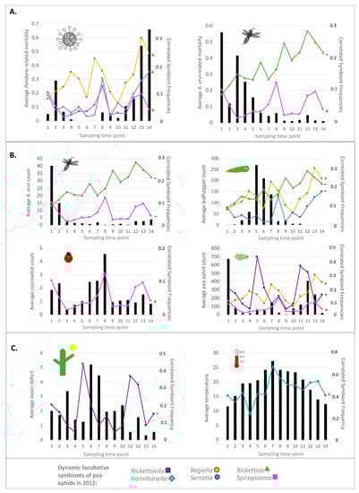 Since selective responses will unfold across spans of several generations, we examined the capacities for environmental factors from the prior sampling period (i.e., t-2 weeks—equivalent to 1.2 pea aphid generations, on average, in 2012) to predict frequencies of symbionts at time t. Focusing only on a priori hypothesized variables, we re-assessed negative results for the correlations expected between: Serratia vs. A. ervi parasitoids (based on an un-repeated finding, from 1 clone/strain [98]); Rickettsia, Serratia, and Regiella vs. temperature; Regiella vs. coccinellid predators; Serratia vs. vapor deficit; and both Rickettsia and Rickettsiella vs. Pandora pathogens. Given predicted relationships between Regiella and the development of wings in aphids [116], we further tested for a non-selective, plasticity-induced correlation between this symbiont vs. the proportion winged aphids.