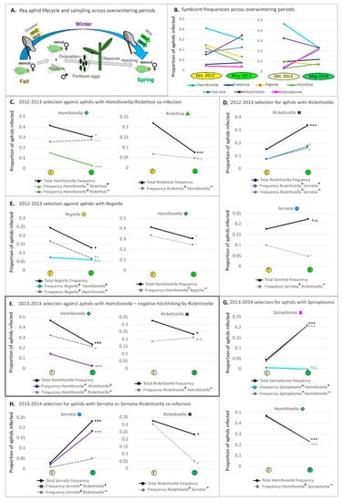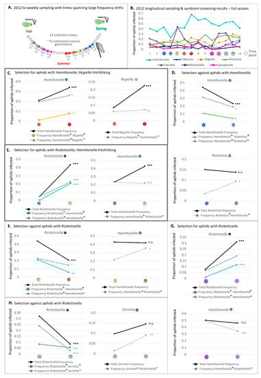 - Smith, A.H.; O’Connor, M.P.; Deal, B.; Kotzer, C.; Lee, A.; Wagner, B.; Joffe, J.; Woloszynek, S.; Oliver, K.M.; Russell, J.A. Does getting defensive get you anywhere?—Seasonal balancing selection, temperature, and parasitoids shape real-world, protective endosymbiont dynamics in the pea aphid. Mol. Ecol. 2021, 30, 2449–2472. [Google Scholar] [CrossRef]