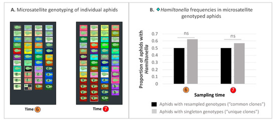 To test this alternative to our hypothesis of direct selection on symbiont-conferred phenotypic variation, we performed microsatellite genotyping on 95 aphids from Times 6 (2 July, n = 51) and 7 (18 July, n = 41) of 2012, when Hamiltonella showed its greatest 2-week frequency increase (26.2%). In selecting aphids for genotyping, we aimed for a 50:50 split between Hamiltonella positive and negative aphids. Due to varying efficacy of microsatellite PCRs we came close to this ratio, with 59% of genotyped aphids from Time 6 harboring Hamiltonella, compared to 54.9% at Time 7. We genotyped these aphids at the six loci—S23, S24, ApH10M, APF08M, S30, and Aph08M—using a multiplex protocol and previously published primers described in Table S3 [67,110,111]. With these data we looked for the possibility that a common clone, or clones, with incidental tendencies toward high (or low) Hamiltonella infection might have proliferated (or declined) between Times 6 to 7. Assignment to particular common clones vs. singleton genotypes was performed on the basis of whether each 6-locus genotype was unique (singletons) or resampled (common clone).