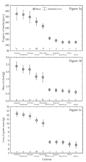 The average number of progeny beetles of S. granarius (a), the mass of produced dust (b), and the grain mass loss (c) observed on the grain of the studied wheat cultivars (* means followed by the same letter do not differ—Tukey’s HSD test).