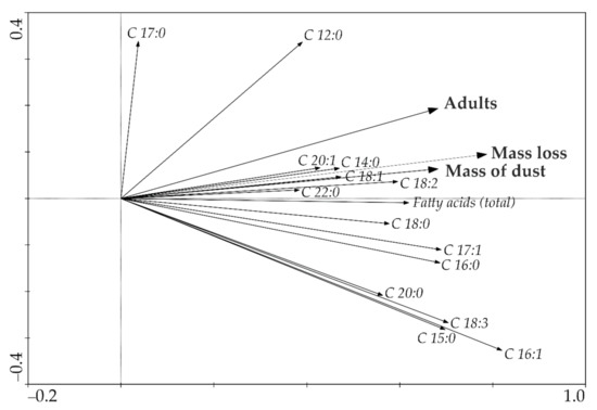The analysed parameters describing the development of the grain weevil were also positively correlated with the growing content of compounds classified as saturate fatty acids (SFA) and unsaturated fatty acids (UFA: MUFA and PUFA). Ordinance techniques were also used to assess the relationship between the parameters describing the development of S. granarius and the content of the tested fatty acids (redundancy analysis—RDA). This type of analysis puts in order samples along a gradient, which is represented by an axis of an ordinance diagram, in this case, based on data on the content of fatty acids in wheat kernels and the parameters describing the development of S. granarius. Interpretation of this diagram implicated a strong correlation between the variables, such as the number of individuals in the pest’s offspring generation, the mass of dust, and loss of grain mass, versus the first ordinance axis (Figure 2).