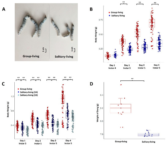 In the daily practice of breeding silkworms, individuals with a specific phenotype are selected and bred in an isolated environment. We observed that solitary individuals are always smaller in body size compared to group-living individuals. It is possibly solitary living that causes the loss of body weight. For a validation, we tried to evaluate the phenotypic difference between the silkworms (strain Dazao) intentionally bred in a solitary environment and those bred in groups. We kept hundreds of silkworms from the same parents in a group-living environment and randomly selected 100 individuals in the first day of the fourth instar. Of the 100 individuals, 50 were bred in a solitary environment and 50 were bred in a group-living environment. Plentiful food was provided in both breeding modes. The solitary silkworms were significantly lighter in the days from the first day to the third day of the fifth instar compared to group-living counterparts (Figure 1A,B). On the third day of the fifth instar, the weight of group-living silkworms (0.70 g median) was more than 50% higher than that of solitary silkworms (0.34 g median). Repeated experiments confirmed these results (Figure S1).
