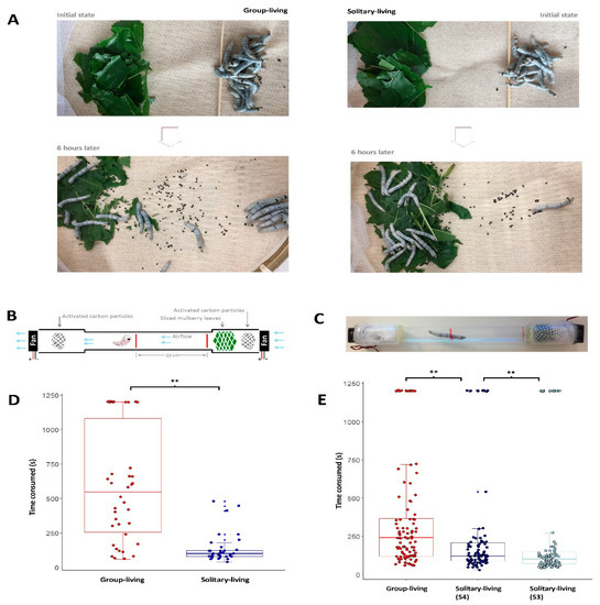We performed behavior experiments to compare solitary and group-living silkworms. First, we tried to test the movement of silkworms being lured by food, mulberry leaves. At the beginning, we put the solitary or group-living silkworms in one side and slices of mulberry leaves in another side, 10 cm away. Theoretically, silkworms should move towards the mulberry leaves. Six hours later, 15 out of 16 solitary silkworms and 9 out 17 group-living silkworms arrived at the place with food (Figure 2A). The difference is significant (Chisq test, p-value = 0.0085), suggesting an increased agility associated with solitary living. For a further validation, we performed a more rigorous experiment. We made a device to test the behaviors of silkworms under food luring (Figure 2B,C). The device was a transparent tube with wrapped activated carbon particles located at the ends for to avoid disturbance to the atmosphere in the device caused by outside odors. Fans equipped at the openings of the tube brought a unidirectional airflow across the mulberry leaves and the tested silkworm. The silkworm and the mulberry leaves were 10 cm apart at the beginning. Lured by the odor of mulberry leaves, the silkworm, in most cases, moved towards the mulberry leaves and finally stopped at the location with the mulberry leaves. We recorded the time taken to pass the 10 cm distance. In a few cases, silkworms stopped at the middle of the tube for more than tens of minutes. In order to avoid an unlimited waiting time, we set 20 min as the upper limit for recording. If a silkworm did not arrive at the terminal after 20 min, we terminated the test and recorded 20 min as the time taken. Solitary silkworms (100 s in median) took less time (Chisq test, p-value < 0.01, Figure 2D) than their group-living counterparts (545 s in median). We repeated the experiments and confirmed the results (Figure S2). We compared the performances of S3, S4 solitary and group-living silkworms. We found that the longer the solitary life is, the faster the silkworms move under food luring (Figure 2E).