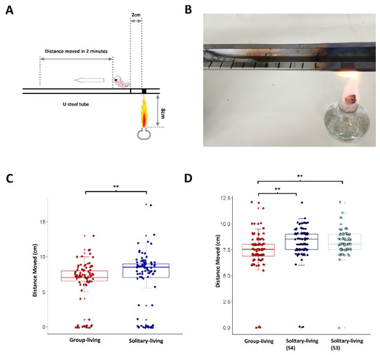 Moreover, we constructed another device to test silkworms’ responses to an instant environmental stress, e.g., intense heat. In this experiment, solitary or group-living silkworms were placed into a U-shape steel tube. At the beginning, the tube was heated by a spirit lamp at the position of 2 cm from the tail of the silkworm located at the starting position. Two minutes later, the distance moved was recorded. We cooled the tube for 5 min in ice after each test. We marked a scale in centimeters on the tube for convenience in recording.